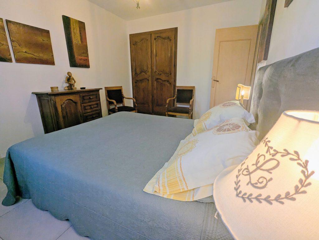 - Une chambre avec un lit (couchage 160 par 200), commode, fauteuils, exposition Sud donnant sur le jardin